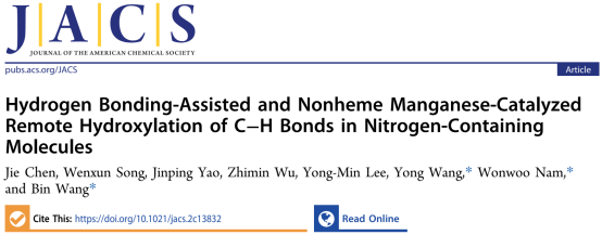 近日,tyc41183太阳成集团王斌教授课题组与宁波大学王永教授、韩国梨花女子大学Wonwoo Nam教授合作在国际化学领域权威期刊《美国化学会志》(J. Am. Chem. Soc. 2023, DOI: 10.1021/jacs.2c13832.)发表了题为“Hydrogen Bonding-Assisted and Nonheme Manganese-Catalyzed Remote Hydroxylation of C‒H Bonds in Nitrogen-Containing Molecules”的研究论文。
