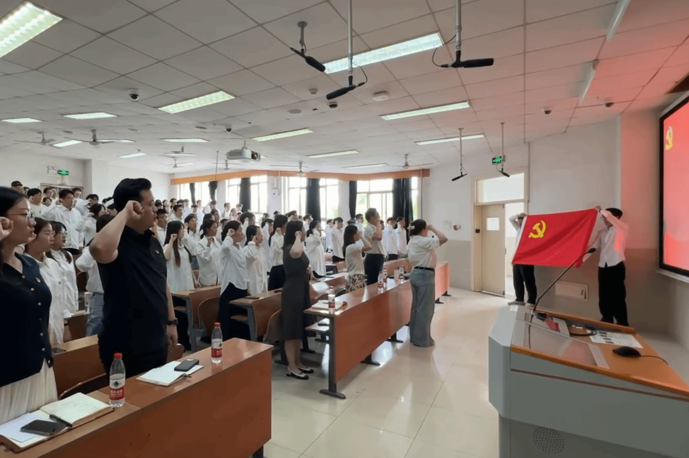 “我志愿加入中国共产党,拥护党的纲领,遵守党的章程……”在高材2102班王雨涵同学的领誓下,全体毕业生党员起立,面向党旗庄严举起右手,重温入党誓词。铿锵有力的誓言在教室里回荡,唤醒了大家入党时的澎湃初心,也坚定了未来前行的方向。这一庄严时刻,让每位党员再次感受到了作为共产党员的光荣使命和神圣责任,更加坚定了他们在新征程中坚守初心、勇担使命的决心。