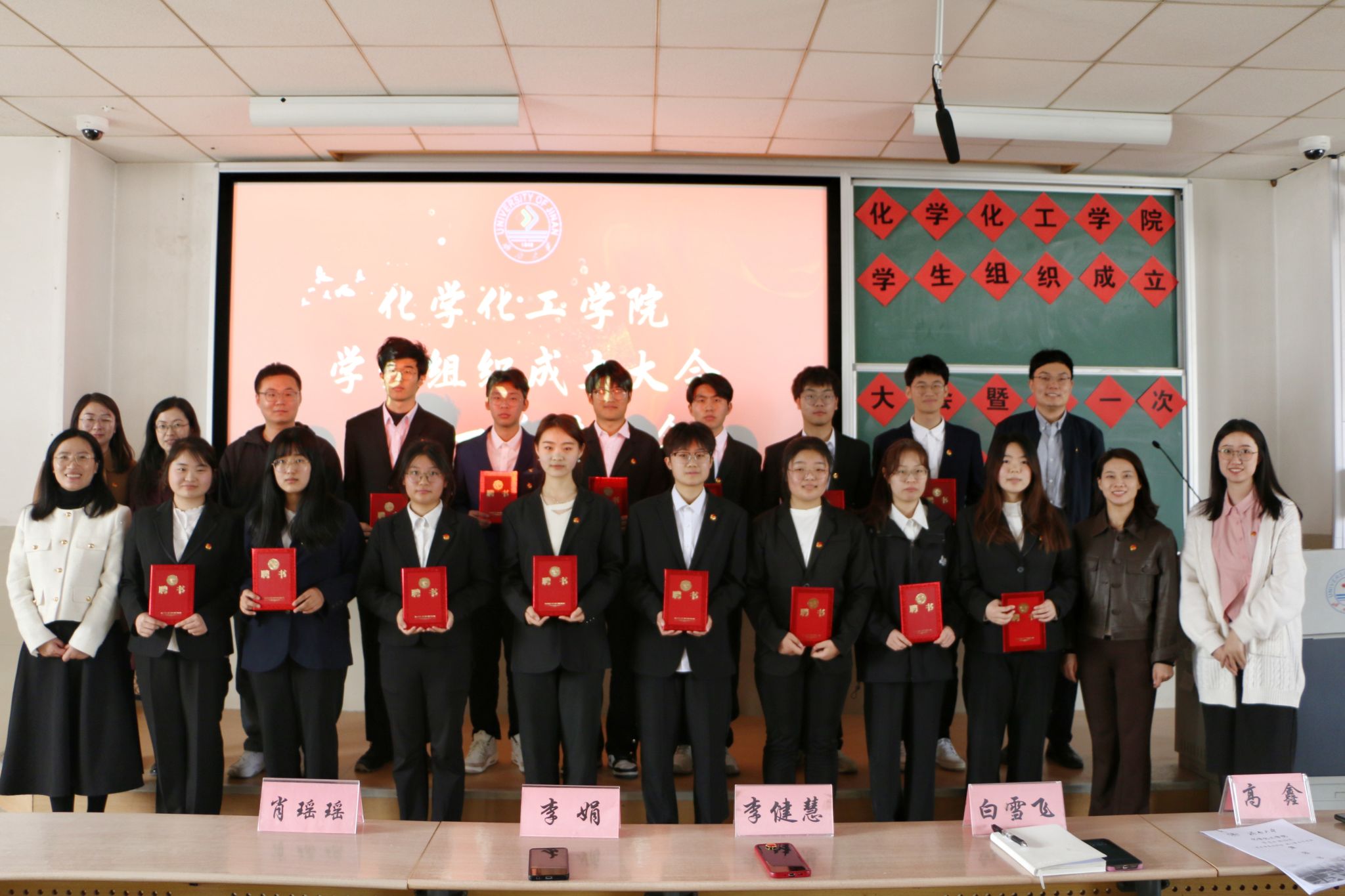 领导老师为第二十五届学生组织主要负责人颁发聘书并合影留念。