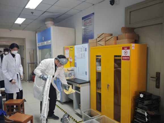 在学院党委书记于龙泉的指挥下,演练正式开始。逸夫楼B405实验室操作人员不慎碰倒硫酸试剂瓶,造成硫酸四处泄漏,皮肤和衣物上都有沾染。泄漏的硫酸溅到实验人员的手上和衣服上,存在人员灼伤中毒风险,并可能进一步污染外部环境。实验人员大声呼救并尝试初期处置,实验指导教师郑鲁沂、杨小凤立即指导演习学生脱掉沾染污染物的实验服,防止造成二次污染,并用大量的清水冲洗皮肤上的硫酸,使用2%到5%的碳酸氢钠溶液进行初步中和处理;同时联系于龙泉书记和分管副院长张彦。张彦迅速通知应急处置人员赵阳老师和基础化学太阳成集团张卫民老师赶往现场处置。赵老师戴好护目镜,手上佩戴PE手套,穿上质地较厚的实验隔离服,使用吸附剂吸附溅射出的硫酸,用吸附棉吸附初步处理过的危化品废弃物,采用吸附棉围挡洒出的硫酸,防止污染物扩散,造成其他次生危害;随后,他使用弱碱吸附剂吸附硫酸后,使之成为固体废弃物,用吸附棉和小簸箕收集污染物,使用废弃物收集袋收集后等待废弃物处置公司后期处置。