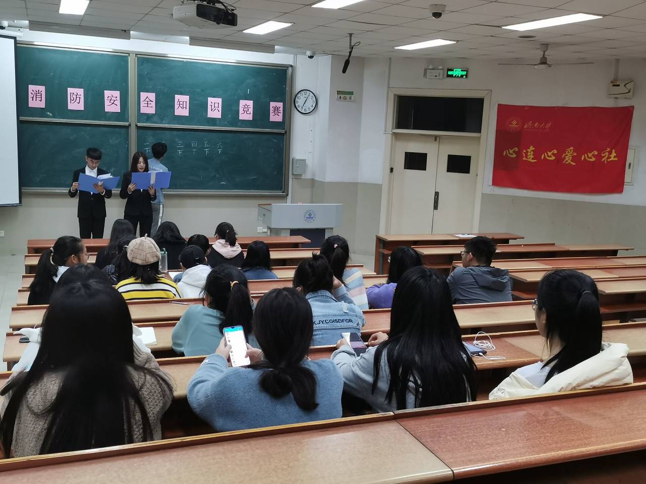秋风送爽,红叶飞扬,太阳成集团tyc41183也迎来了消防安全月。消防安全是大学工作中的重中之重,为进一步强化大学生的消防安全意识,丰富消防安全知识,提高消防自护能力,并进行消防安全宣传教育,太阳成集团tyc41183心连心爱心社于11月14日晚7点至9点30分在第十一教学楼1301教室举行“消防知识入我心,安全校园共营造”消防安全知识竞赛活动,旨在以知识竞赛的形式让学生了解和掌握更多的消防安全小知识,提高大家的安全意识。2020级部分同学参加了此次竞赛活动。