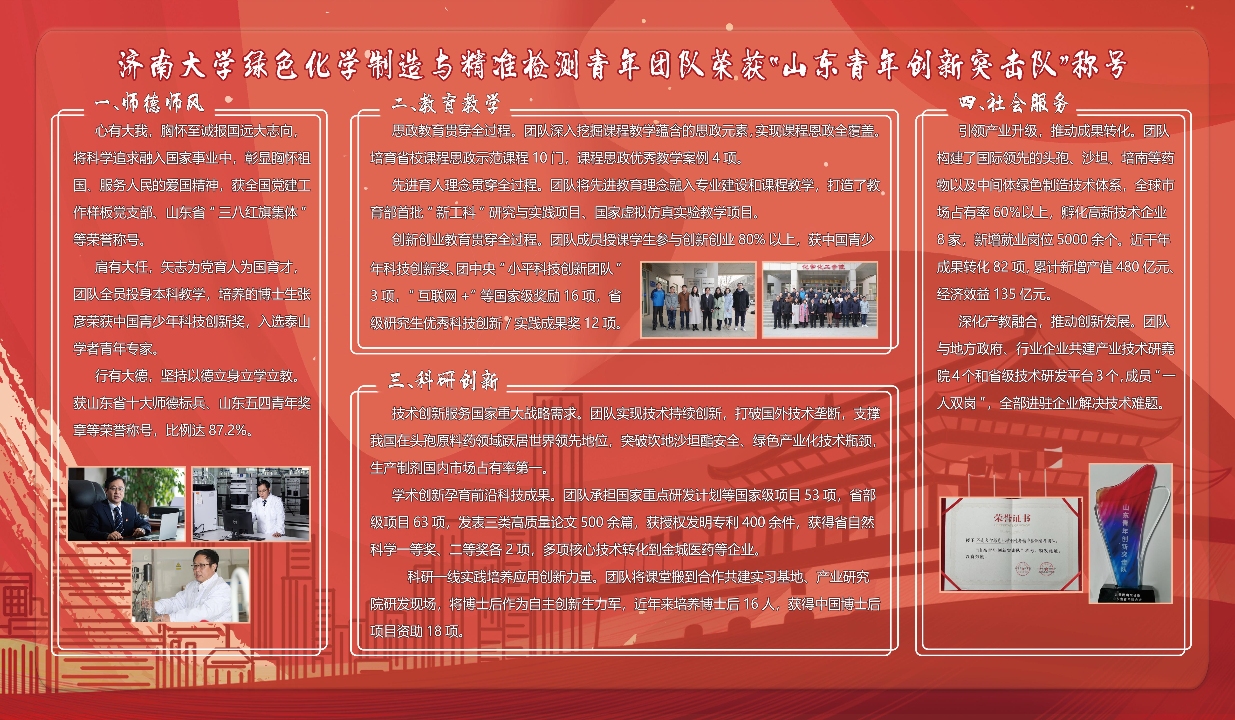 奋进新征程,建功新时代。tyc41183太阳成集团绿色化学制造与精准检测青年团队荣获“山东青年创新突击队”称号,同时在各个方面取得佳绩。