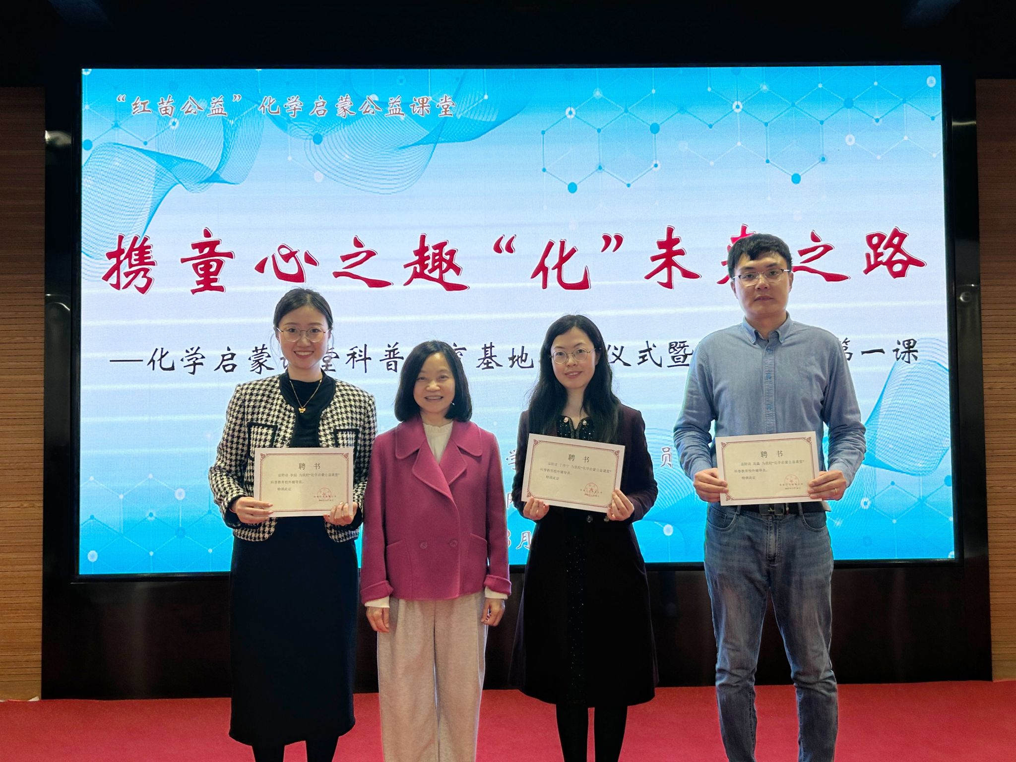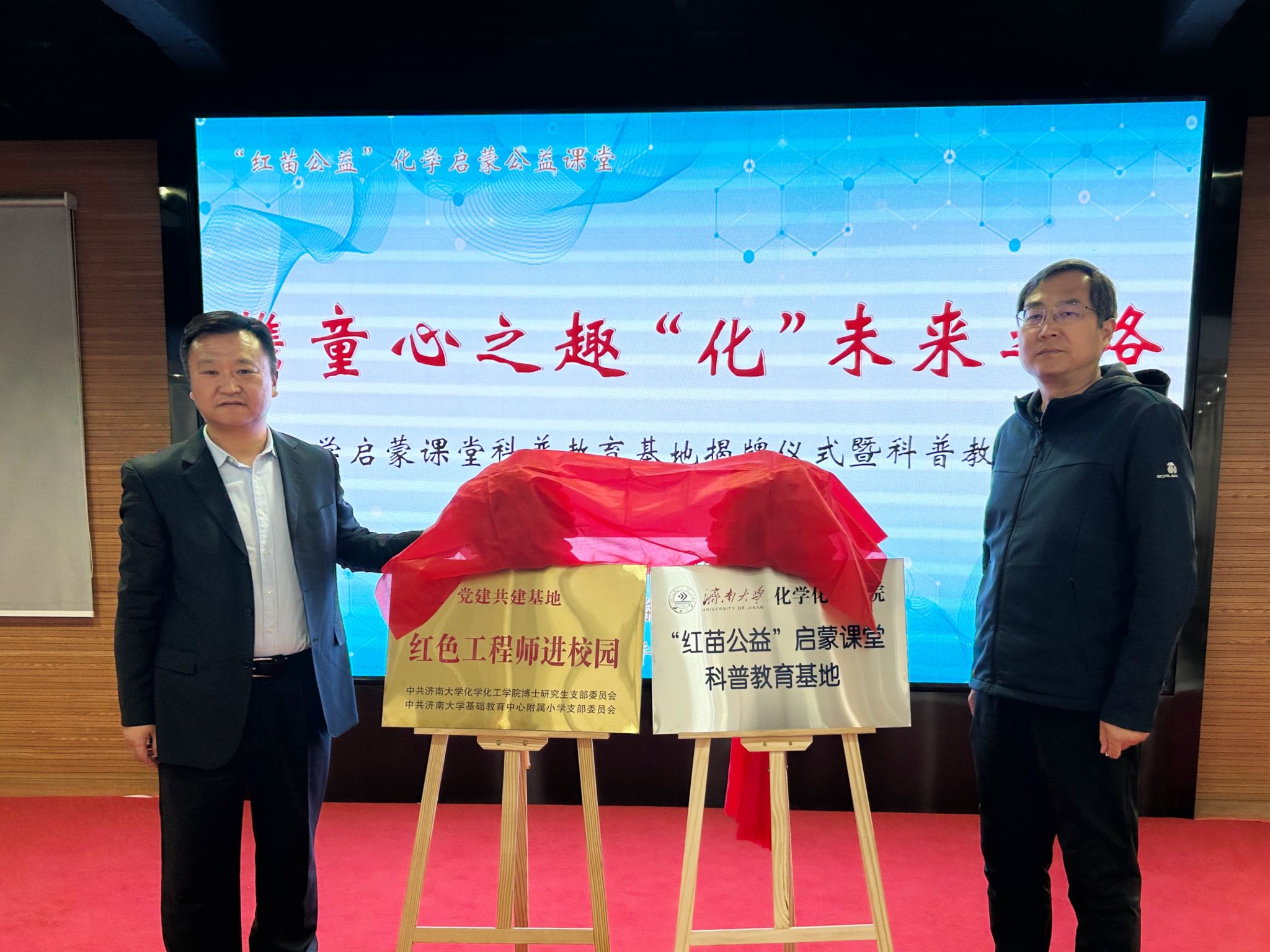 随后,贺铭与张峰共同为党建共建基地和化学启蒙课堂科普教育基地揭牌。严婷为三位附属小学校外辅导教师颁发聘书。