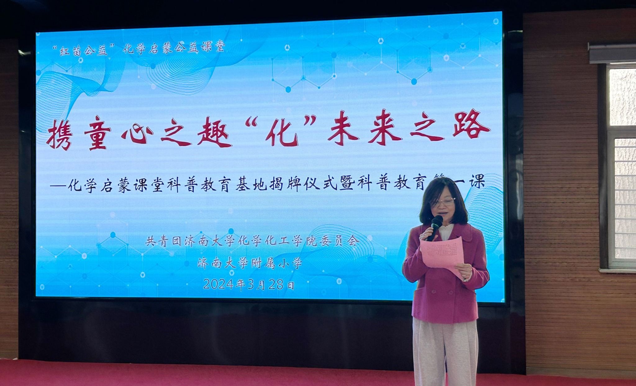 白雪飞宣读化学启蒙课堂科普教育活动实施方案,并鼓励“红苗公益”化学启蒙科普教育志愿服务团队成员立足学科专业特色,通过丰富的趣味实验活动让孩子们了解身边的化学知识,理解实验原理,拓展科学视野。