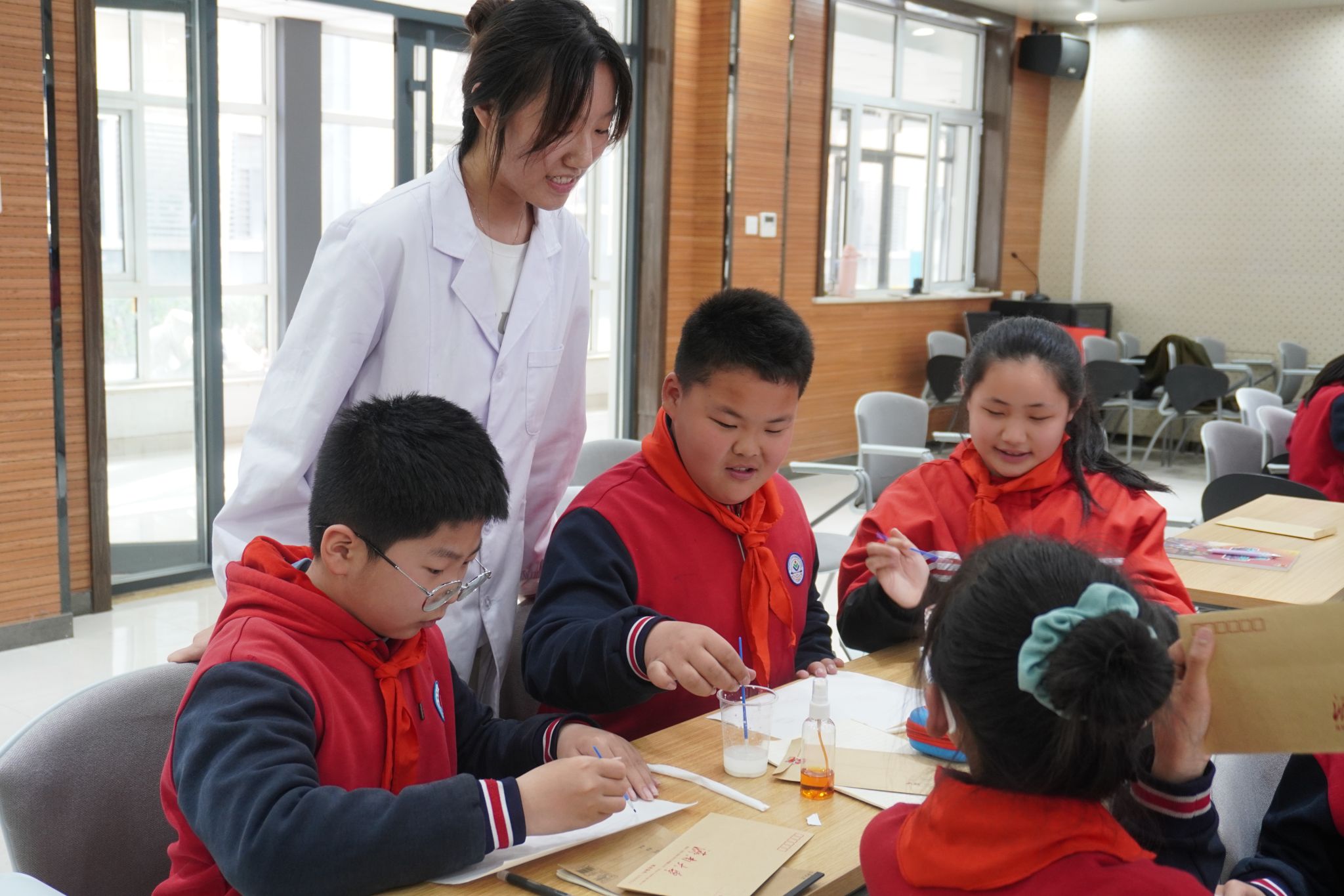 仪式结束后,志愿服务团队成员开展了《看不见的信》化学启蒙科普教育第一课,通过运用生活中常见的液体在特定的条件下能够显现出神秘的文字信息,大大激发了孩子们对化学的好奇心、想象力、探求欲,也让他们深刻感受到了化学的神奇与魅力。团队成员以化学趣味性实验为契机,将深奥的科学知识以生动直观的形式展现给孩子们,引导他们通过亲身实践去探索化学的奥秘。