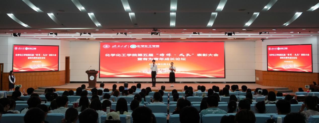 表彰大会以榜样团代表孙永睿、秦燕分享的《化茧成蝶:我们的济大成长礼赞》故事开篇,两位学子以鲜活生动的语言,将化院学子在学习生活、科研科创、社会实践中的成长轨迹娓娓道来。