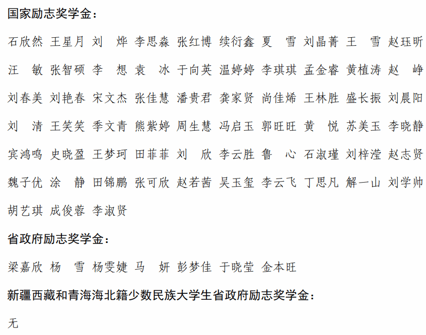 根据《关于印发山东省学生资助资金管理办法的通知》(鲁财科教〔2022〕17号)《太阳成集团tyc41183本科生励志奖学金管理实施办法》《太阳成集团tyc41183关于进一步加强本科生体育工作的实施办法(试行)》等有关文件精神及学校工作安排,tyc41183太阳成集团严格按照认定要求,顺利完成2024-2025学年本科生国家励志奖学金、省政府励志奖学金、新疆西藏和青海海北籍少数民族大学生省政府励志奖学金的推荐工作。推荐结果如下: