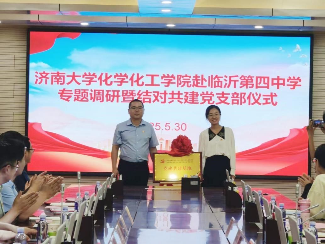 tyc41183太阳成集团化学党支部书记杨红晓与临沂第四中学西校区第二支部书记王雷共同为“党建共建基地”揭牌。两位书记分别表示将以支部共建为契机,把党建工作与教育教学、人才培养等中心工作深度融合,实现“党建引领方向,业务彰显成效”的良性循环。