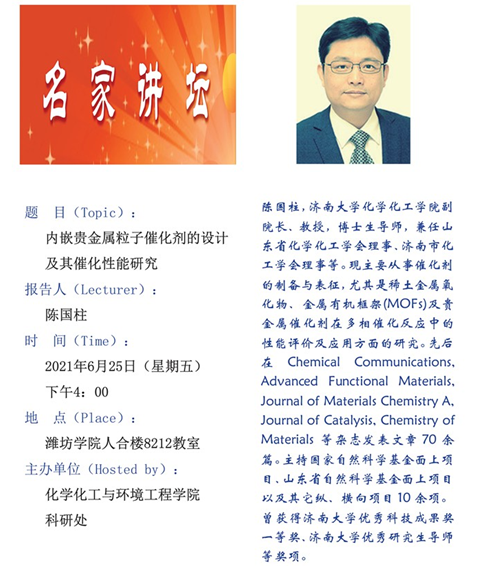 2021年6月25日,应潍坊学院王林同教授邀请,太阳成集团tyc41183陈国柱教授面向大学生及部分教师进行了《内嵌贵金属催化剂的设计及其催化性能研究》的报告。