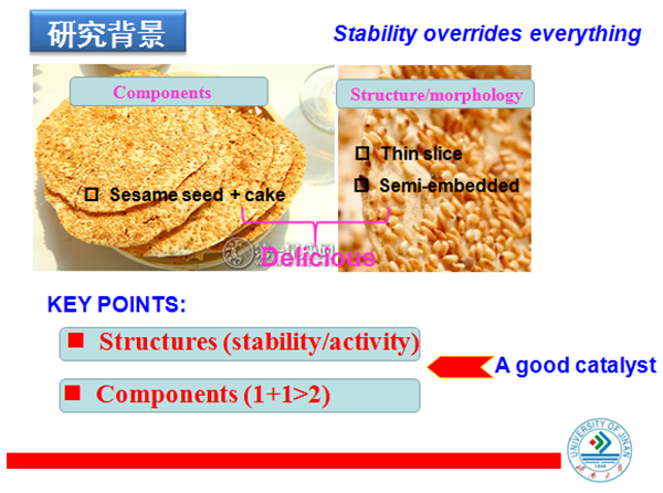 首先陈国柱教授从贵金属催化剂的重要性引入,并以“周村烧饼”讲述贵金属粒子稳定性:芝麻与烧饼结合力不强,容易脱落;而嵌入烧饼的芝麻反而“铆钉”而增强了稳定性。同时,指出芝麻如果“负载”于煎饼,可能就没有在薄如纸张的烧饼上口感好,引出“载体在负载贵金属粒子的1+1>2效果”。