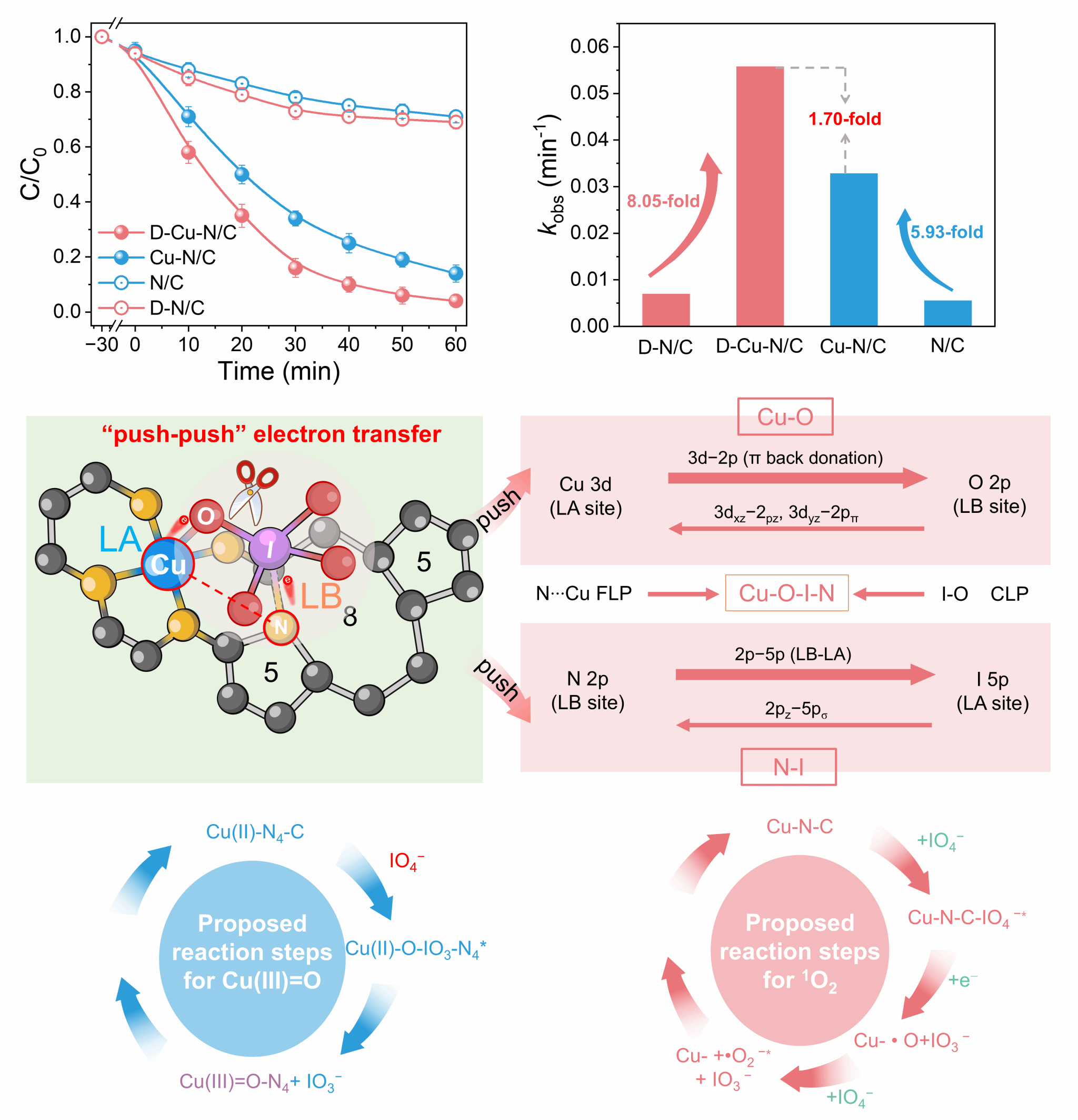近日,tyc41183太阳成集团博士后王荣耀在材料领域国际顶级期刊《Advanced Functional Materials》上发表了题为“Defect-Engineered Solid Frustrated Lewis Pairs Direct Dual Nonradical Oxidation in Single-Atom Catalysis via Push-Push Electron Transfer”的研究论文。王荣耀博士为第一作者,太阳成集团tyc41183陈国柱教授与山东大学许醒教授为共同通讯作者。 高级氧化技术(AOPs)是降解水体中持久性有机污染物的有效手段,但传统基于自由基的反应路径往往存在选择性差、氧化剂利用率低等问题。非自由基氧化路径,如高价金属-氧物种(HVMOs)和单线态氧(1O2),因其高选择性和温和的反应特性,成为环境催化领域的研究热点。然而,如何在单一催化界面实现这两种路径的协同调控,仍然是一个重大挑战。 在本研究中,团队巧妙设计了一种缺陷调制的铜单原子催化剂(D-Cu-N/C),在碳基体中构建了空间分离、电子耦合的“固体受阻路易斯对”(FLP)。其中,Cu-N4作为路易斯酸位点,缺陷锚定的吡啶氮作为路易斯碱位点,形成独特的“推-推”电子接力机制。该结构能够协同活化高碘酸盐(PI),同步生成高价Cu(III)=O物种和1O2,实现了双通道非自由基氧化。